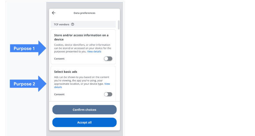 갑자기 CMP 이야기하다가 등장한 TCF는 뭐냐? 바로 투명성 동의 프레임워크(TransParency & Consent Framework)인데 어떤 정보를 어떤 목적에 쓰는지 실제로 유저가 동의했는지에 대한 정해진 포맷을 표현한 표준형식입니다.